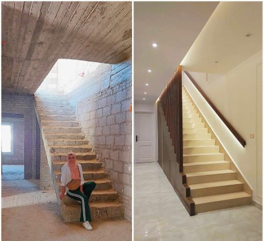 ومن هنا جاءت معالجة نادين صالح للسلم معمارياً أولاً؛ حيث قامت بتركيب أعمدة السلم؛ لتثبيته فى السقف والأرض معاً، وبعدها صممت تجاليد مابين ثابت ومتحرك وأدراج ودرف تخزين، مع عمل منطقة Laundry تحت السلم مع أرفف تخزين.