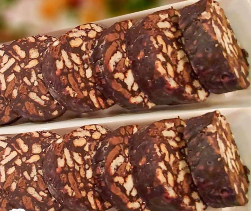 يكسرالبسكويت قطع من دون فرم، يسخن اللبن وتضاف باقي المقادير وتقلب حتي تتجانس ثم ترفع علي نار هادئة دقيقتين من دون غليان، ثم تصب فوق البسكويت قي بولة عميقة، ويقلب الخليط مع البسكويت حتي يغطي تماما، ثم يوضع فوق استرتش ويشكل رول ويغلف جيدا قم يوضع في الفريزر 4 ساعات